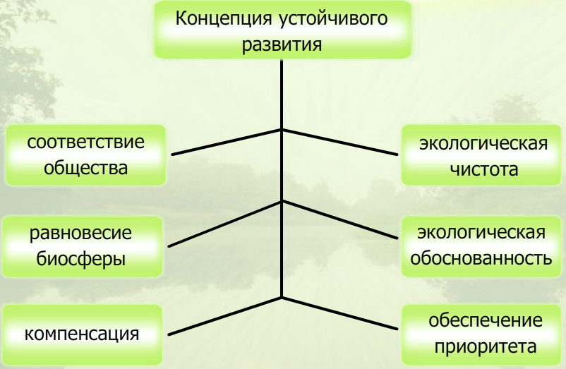 Концепция устойчивого экологического развития территории базируется на принципах: оптимального соответствия общества и природной среды, естественного равновесия биосферы, компенсации соответственно значениям меры производимых у природы изъятий, экологическую чистоту человеческой деятельности, комплексности и экологической обоснованности принимаемых решений, обеспечения приоритета общественного интереса над частными и прочее. Перечисленные выше принципы сводятся к тому, что развитие экономики может и должно быть таким, чтобы оно не сопровождалось опасным загрязнением и разрушением природной среды. Это правило возникло из глобального, мирового рассмотрения концепции устойчивого развития территорий.