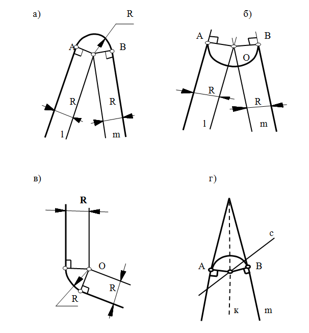 О нүктесі доға центрі – (1а,б,в сурет ) L және m түзулеріне параллель және олардан R қашықтықта орналасқан түзулер қиылысында орын алған.