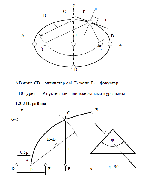 Эллипс (10 сурет) – овалдың бір түрі. АВ және СD эллипс өстері. Р нүктесі – туынды нүктесі, ол арқылы жанаманы өткіземіз.