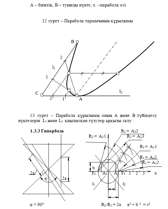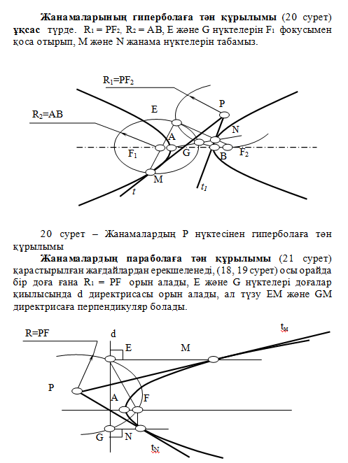 Эллипске, гиперболаға, параболаға нүктелерден жанама құрылымы қисықтан тыс орналасқаны, 10, 11, 12-ші суретте көрсетілген.
