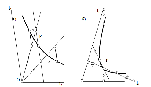 Гиперболаны оның асимтоталары l1 l2 – ге қатысты құруға болады. Бірінші амал (15а сурет) P нүктесі арқылы түзу өтеді, ол l1 және l2 асимтоталарына параллель бағыт алады, туынды сәулелердін қиылысында нүктелер орын алып, О нүктесінен ұштарымен осы түзулермен жүргізіледі. Әрі қарайғы құрылым 15а суретте бағыттармен көрсетілген.