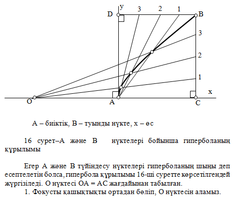 Гипербола құрылымын, олардың осі, биіктігі, тармақтардың фокусы белгілі болған жағдайда, гиперболаны геометриялық анықтаумен тығыз қатыстырамыз (14 сурет).