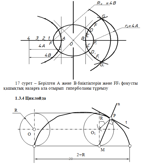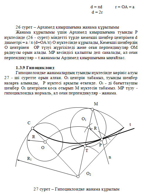 18-ші суретте жанаманың циклойдқа туынды P нүктесінде орналасуы көрсетілген. Туынды щеңбер R = ОС радиусын пайдалана отырып және осы шеңберлердің центрлік сызығын назарға алып, шеңбер ортасының ыңғайын табамыз, P нүктесі – О 1 нүктесімен ыңғайлас. Төменгі нүкте М тік диаметрде туынды шеңбердің қарастырылған жағдайында P нүктесімен қосамыз. МP түзуі – циклойдта P нүктесінде нормаль. t жанамасы n нормаліне перпендикуляр.