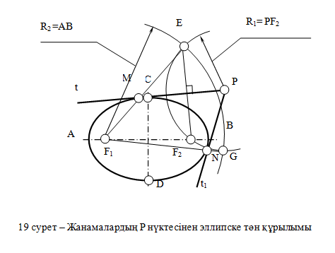 Жанаманың элипске тән құрылымы ( 19 сурет) келесі үлгіде орындалады. Шеңбер доғалары R1 = PF2 және R2 = АВ жүргізіледі, доғалар қиылысында Е және G нүктелерін аламыз да оларды F 1 - мен қосқанда М және N жанама нүктелері табылады.