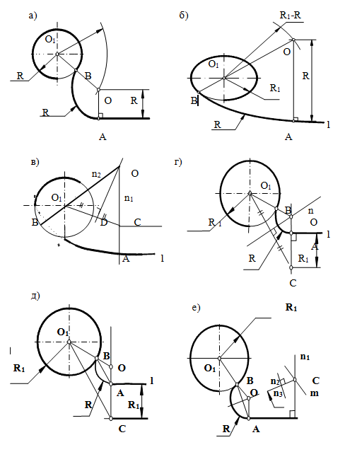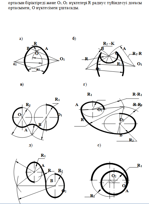 а, б – R радиусы белгілі; в, г, д – А түйіндесу нүктесі берілген; е – В түйіндесу нүктесі берілген