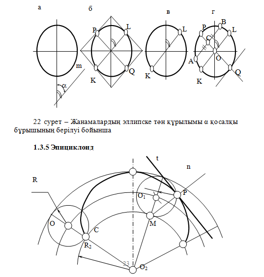б) ОС және ОД (6в сурет) овалдарының жартылай осі белгілі. ОС радиусымен доғаны құра отырып, Е нүктесін табамыз. DЕ радиус доғасы көмегімен F нүктесін құрамыз, n орталық перпендикулярды СF кесіндісіне тұрғызып О1, және О2 нүктелерін табамыз. R1 = О1С және R2 = О2D радиустарымен овал доғасын құрамыз;