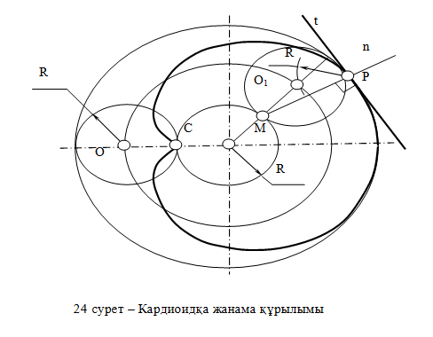 24-ші суретте орын алған жанаманың кардиодке қатысымдық құрылымы туынды Р нүктесінде көрсетілген. Бұл құрылым бұрынғыға ұқсап ыңғайда, яғни кардиоид – эпициклоид, R1 = R мәнінде алынған.