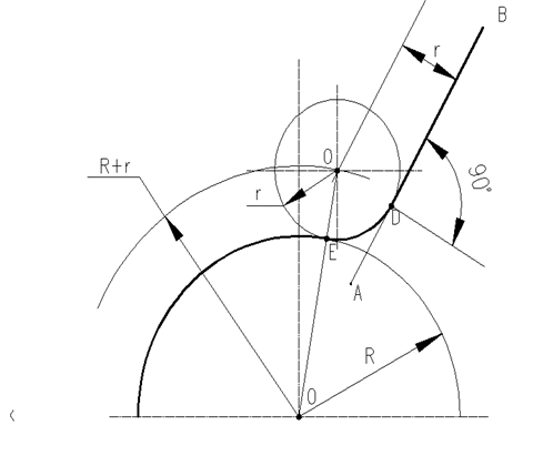 1) түйіндесу центрін табамыз, шеңбер доғаларының R1 + R радиустарымен қиылысу О нүктесін және R2+ R радиустарымен шеңбердің шоғырланымы R1 және R2 радиустарымен сәйкес деп есептеледі;