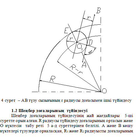 Анағұрлым күрделі есептер деп – түзулердің шеңбер доғаларымен түйіндесу есептерін санайды (2 сурет). (2а, б сурет) есептерде доға радиусы R белгілі. Центрді және R радиусын табу суреттер ыңғайынан көрініс табады.