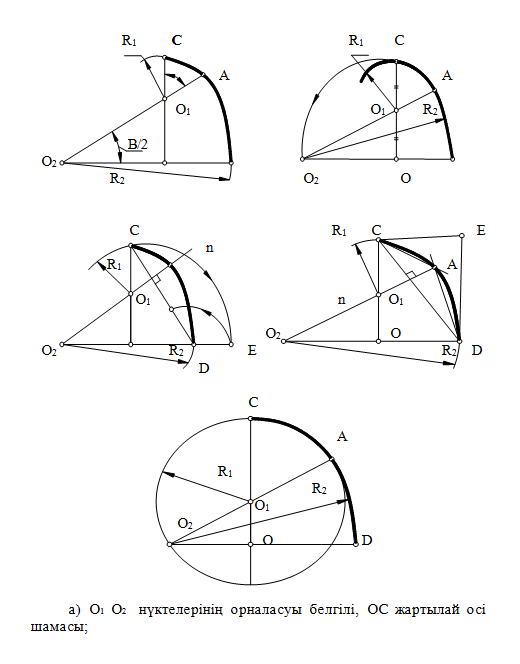 Әр осындай овал төрттігінде (6а сурет) R1 және R2 радиуысының екі доғасы, О1 және О2 нүктесі (6а сурет) белгілі және бір жартылай ось шамасы айқын, a/2 және β/2 бұрыштарына сүйелді.