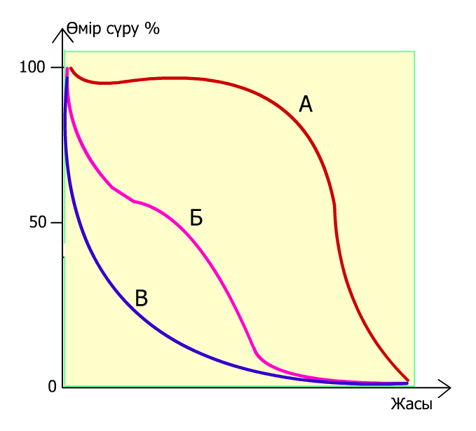 Популяцияның өлу динамикасын жасына қарай өмірсүру қисық сызығынан көруге болады. Бұл қисық сызықтың үш типі бар: өлудің негізгі факторы қартаю (суретте бұл қисық сызық А-әрпімен берілген), популяцияда ерте өлудің пайда болуы Б-әрпімен берілген, сонымен қатар ағзалар арасындағы үнемі өлімнің болуы В-әрпімен көрсетілген.