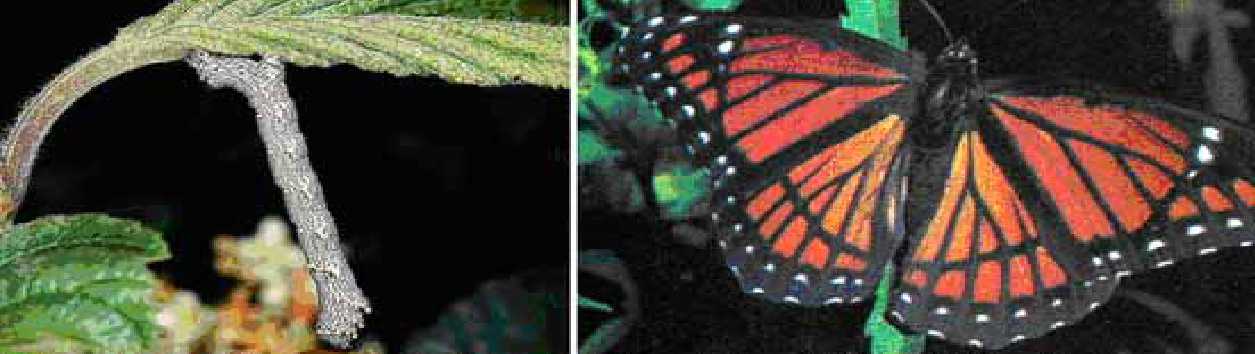 Мимикрия. Солжақта – жұлдызқұрт, өсімдіктің бұтасы сияқты. Оңжақта – вице-король көбелегі улы монарх- көбелегіне ұқсауы