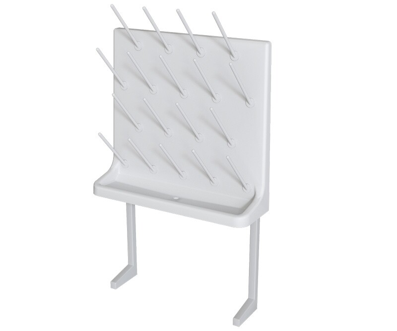 Сушка на колышках является самым распространённым способом сушки. В лабораториях обычно всегда есть специальная доска с колышками, размещённая над раковиной для мытья посуды (рисунок 3.3). Вымытую посуду надевают на эти колышки и оставляют для высыхания. Для исключения загрязнения посуды в процессе сушки важно следить за чистотой колышков, протирая их; при необходимости перед размещением посуды можно обернуть колышки фильтровальной бумагой.