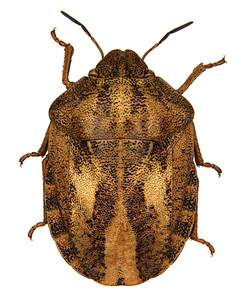 The bug measures 10-13 mm in length and 6.8-8.8 mm in width, being broadly oval and convex (Figure 8). The colouration of the insect varies from sandy yellow to black, often in a uniform shade or with irregular patterns; the scutellum, which has straight sides, covers most of the abdomen.