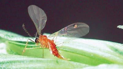The midge has a length of 1.5 to 2.5 mm, with a slim body that is orange or orange-red, and a brown head with black eyes (Figure 41). Its ovipositor is flat and extends about halfway along the length of the abdomen (Kenneth, 1931; Basedow, 1979).