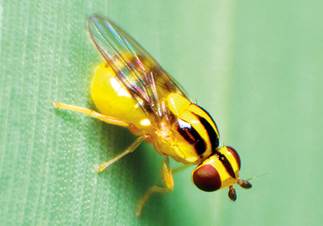 The fly is 3.5-4 mm long. The adult insect is pale yellow with three black stripes running along the mid-back and a dark triangular spot on the forehead. The terminal segments of the legs are shaded, and the third segment of the antennae is black.