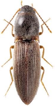 This beetle measures between 6 and 8.5 mm in length and ranges in colour from light to dark brown. The front and often the back corners of the pronotum, as well as the elytra, antennae, and legs, are generally lighter in colour and have a fine covering of grey hairs. The pronotum's width is about the same as its length. The edge of the hind thoracic sternite is at least two-thirds the width of the episternum in that same area (Figure 54).