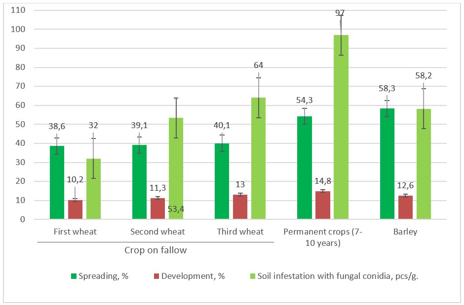 The prevalence of root rot in the first crop of spring wheat averaged 38.6% over 3 years, with a development rate of 10.2%. On continuous plantings, the prevalence was 54.3% with a development rate of 14.8%. Soil contamination with B. sorokiniana conidia ranged from 32 to 64 per g of soil, depending on the preceding crops in the crop rotation. When spring wheat was continuously cultivated for more than 10 years, soil contamination reached 97 conidia per g of soil (Figure 28). In certain years and regions, the disease developed more intensively when preceded by complete fallow compared to the second and third crops. This can be attributed to two factors: firstly, the field under complete fallow was allocated after a susceptible predecessor (e.g., barley); secondly, favourable conditions for the growth and development of both spring wheat and the pathogen are created when wheat is sown after complete fallow in the steppe zone.
