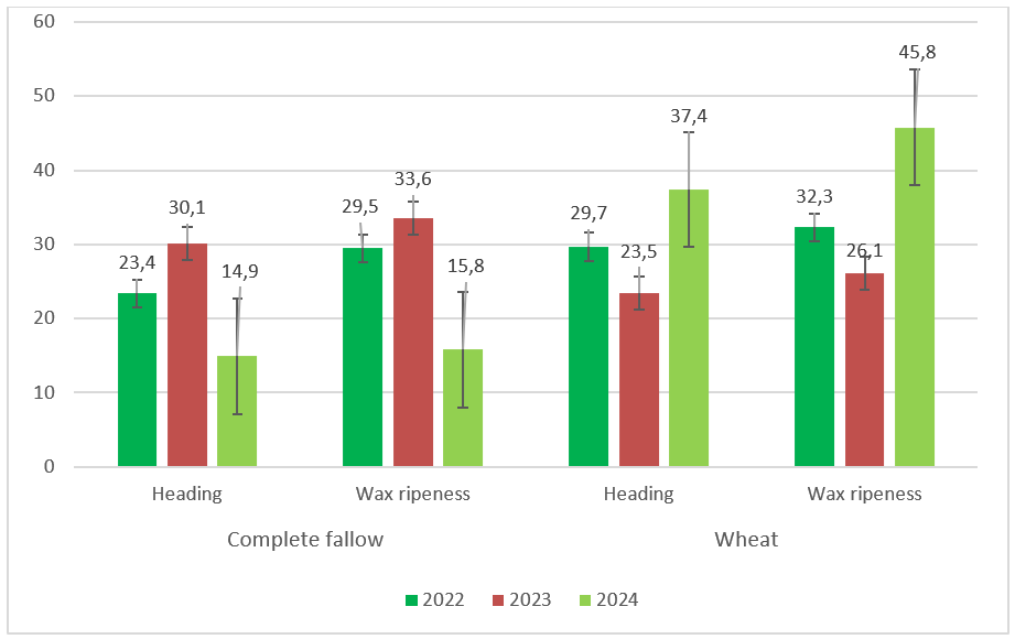 In a grain-fallow crop rotation, depending on the year and climatic conditions, the prevalence of root rot in spring wheat during the heading and milky ripeness stages ranged from 14.9% to 33.6% after complete fallow and from 23.5% to 45.8% after spring wheat preceding (Figure 29).