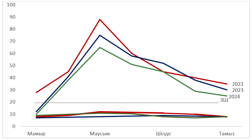 Тамыр шірігін тудыратын қоздырғыштың конидияларының болуы топырақты флотация әдісімен анықталды. Павлодар облысының әртүрлі аудандарынан алынған топырақ үлгілерін алдыңғы дақылдарына байланысты талдау барысында Bipolaris sorokiniana саңырауқұлақтарының кездесуі зерттеу жылдарының әрқайсысында экономикалық шекті деңгейге жеткені байқалды. Бұл саңырауқұлақ шілде-тамыз айларында басым болды (26-сурет). Далалық пен зертханалық тәжірибелері айналымды сақтау тамыр шірігінің дамуы мен таралуында маңызды рөл атқаратынын көрсетті. Дақылдардағы тамыр шіріктеріне сезімтал дақылдардың айналуын сақтау топырақта инфекцияның жиналуын тежейді.