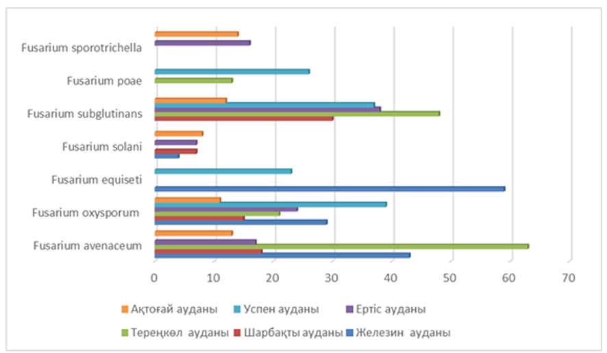 Зерттеу барысында зерттелген топырақ үлгілерінде Fusarium oxysporum, Fusarium avenaceum, Fusarium solani, Fusarium subglutinans сияқты фузариум түрлері басым болды. Fusarium equiseti және Fusarium sporotrichiella аз таралған. Алынған нәтижелер бойынша Fusarium ұрпағына жататын саңырауқұлақтардың популяция тығыздығы бойынша зияндылық шегі жалпы жағдайда аспайды, тек кейбір жағдайларда ғана асып кеткен.
