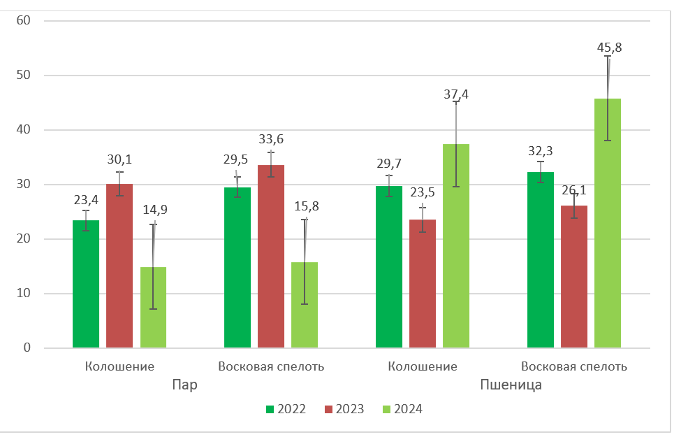 В зернопаровом севообороте в зависимости от года исследования и климатических условий года в периоды колошения и восковой спелости пораженность яровой пшеницы корневой гнилью варьировала в пределах от 14,9 % до 33,6 % по предшественнику чистый пар, по предшественнику яровой пшеница от 23,5 % до 45,8 % соответственно (рисунок 29).