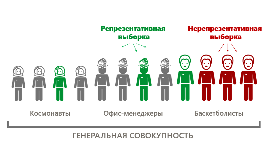 - формирование объема выборки. После определения целевой группы необходимо решить, какое количество респондентов будет участвовать в опросе. Объем выборки должен быть достаточным, чтобы полученные данные могли быть обобщены на всю генеральную совокупность (всю целевую группу). Выборка может быть случайной (например, выборка через генерацию случайных чисел) или стратифицированной (где респонденты делятся на подгруппы по определенным признакам, таким как возраст, пол или социальный статус). Пример репрезентативной и нерепрезентативной выборки представлен на Рисунке 5.1;