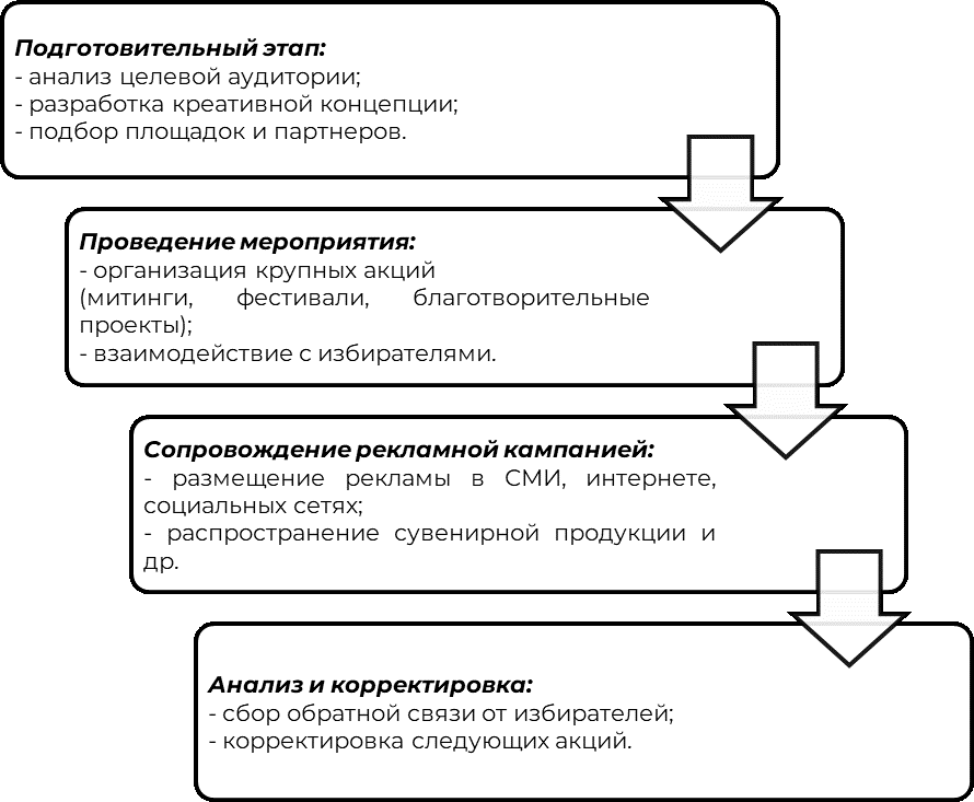 Это тактический подход в предвыборной кампании, который основывается на организации и проведении крупных, заранее спланированных акций или мероприятий, направленных на привлечение внимания средств массовой информации и широкой аудитории. Основная цель этой стратегии – создание ярких информационных поводов, которые СМИ освещают бесплатно, усиливая охват аудитории.