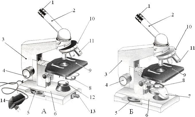 1 – окуляр, 2 – тубус, 3 – тубусодержатель, 4 – винт грубой наводки, 5 – микрометренный винт, 6 – подставка, 7 – зеркало, 8 – конденсор, ирисовая диафрагма и светофильтр, 9 – предметный столик, 10 – револьверное устройство, 11 – объектив, 12 – корпус коллекторной линзы, 13 – патрон с лампой, 14 – источник электропитания