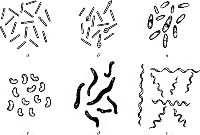 а – бактерия (туыс Bacterium), б – коринебактерия (туыс Corinebacterium), в – бацилла (туыс Bacillus), клостридия (туыс Clostridium), г – вибрион (туыс Vibrio), д - спирилла (туыс Spirillum), е - спирохетта (қатар Spirochaetales)