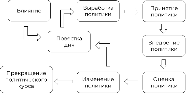 С точки зрения взаимного влияния общественных проблем и действий государственных органов власти можно выделить следующую цепочку взаимосвязей: на первом этапе «проблемы общества – государство»; на втором этапе «государство – политическая стратегия»; на третьем этапе «государство – решение проблем»; на заключительном этапе «анализ проблем – действия государства».