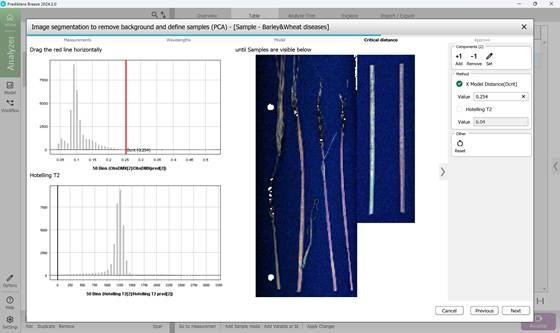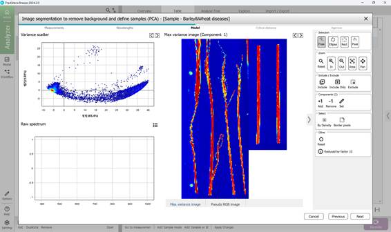 2) белгілі бір толқын ұзындығы диапазонындағы спектрлік жолақтарды таңдау (әдепкі түрде барлық спектрлік жолақтар қосылады); сонымен қатар деректерді алдын-ала өңдеуге арналған функциялар бар – әдетте SNV қолданылады. Бұл кезеңге мыналар кіреді: