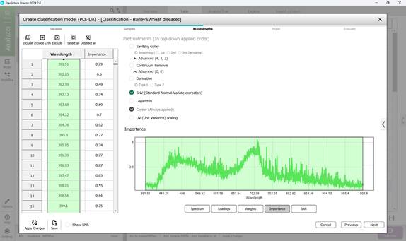 - 3-кезең: зақымданған аймақтардың бастапқы спектрінен толқын ұзындығының диапазонын (әдетте барлық диапазон әдепкі түрде таңдалады) (58-сурет), негізгі компоненттер бойынша модельдік жүктемелерді (59-сурет) таңдау, салмақ коэффициенттерін бағалау (60-сурет); маңыздылық көрсеткіштерін талдау (61-сурет), таңдалған толқын диапазонында сигнал мен шудың қатынасын бағалау (62-сурет). Алдын ала өңдеу кезеңінде SNV (Standard Normal Variate correction) әдісі қолданылады. Бұл әдіс спектроскопиялық деректерде үлгілердің тығыздығы мен қалыңдығындағы айырмашылықтарды, сондай-ақ жарықтың шашырауынан туындайтын мультипликативтік әсерлерді азайту үшін қажет;