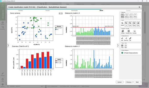 - 5-кезең: құрылған PLS-DA моделін бағалау үш негізгі кесте бойынша жүзеге асырылады: «Observed vs. Calculated», «Overview» және «Variable Overview». «Observed vs. Calculated» графигінде бір осьте – үлгілердің нақты санаттарға жататын шынайы мәндері, ал екінші осьте – модель болжап берген мәндер бейнеленеді. Бұл график үлгілердің санаттар бойынша бөлінуін көрсететін диаграмма болып табылады. «Variable Overview» графигі «R2» дисперсиясын (яғни, модельді оқыту үшін пайдаланылған деректер санаттар арасындағы айырмашылықтарды қаншалықты жақсы сипаттай алатынын) және әрбір санат үшін «Q2» болжау қабілетін (яғни, модельдің кросс-валидация барысында аурудан зардап шеккен дақылдардың нақты аймақтарын болжай алу мүмкіндігін) көрсетеді. Соңында «Finish» батырмасын басу арқылы жіктеу моделін құру үдерісі аяқталады (65-сурет).