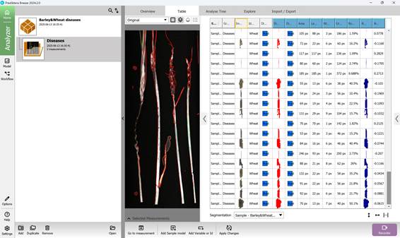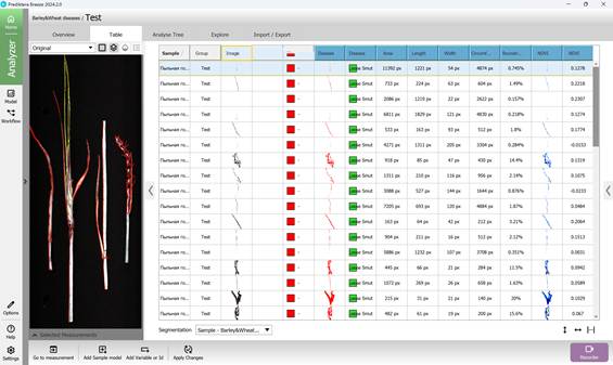 Ауыл шаруашылығы дақылдарының фитопатологиясын жіктеудің оқытылған моделінің тиімділігін бағалау жаңа, бұрын қолданысқа енбеген өсімдік тінінің зақымданған аймақтарының гиперспектралды кескіндері арқылы жүзеге асырылады. Көпарналы спектрлік деректер толқын ұзындығының кең диапазонын қамтып, сау және ауру тіндердің нәзік спектрлік ерекшеліктерін анықтауға мүмкіндік береді.