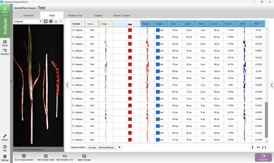 Импорттау кезеңі кескіндерді алдын-ала өңдеуді де қамтиды, ол кескіндерді импорттау шебері арқылы жүзеге асырылады. Бұл шебер кескіндерді калибрлеу, шуды жою және сегменттеу қадамдарынан тұрады (90, 91-сурет). Сегментация бұрын құрылған эталондық (базалық) модельге сүйене отырып жүргізіледі. Одан әрі PLS-DA моделіне негізделген классификация алгоритмі қолданылады. Алгоритм алдын ала белгілі спектрлік белгілер негізінде, егер зақымдану түрі кескінде болса, оны анықтайды. Нәтижесінде жаңа гиперспектралды кескіндерге классификациялық модельді қолданудың нәтижелері алынып, «Тозаңды қара күйе» және «Қоңыр тат» қоздырғыштарымен зақымданған дақылдарды диагностикалау мүмкін болады (92, 93-сурет). Мұндай айырмашылықтарды көрінетін спектрдегі камералар немесе дәстүрлі визуалды әдістер арқылы анықтау қиын.