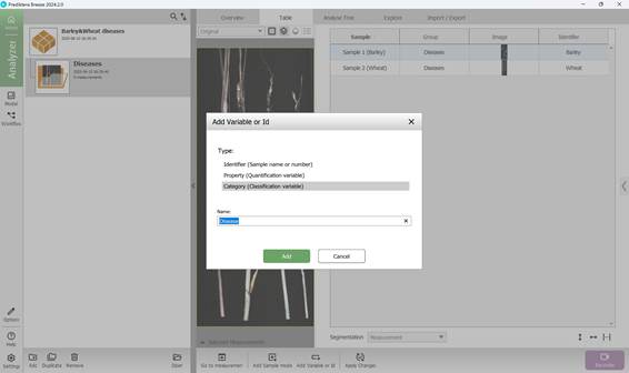 Маркировка данных для обучения может включать в себя как добавление основных классификационных показателей, так и дополнительных, содержащих второстепенную информацию. После выхода в меню проекта на левой боковой панели можно увидеть все исследуемые образцы в формате таблицы. В первую очередь добавляется дополнительная переменная или идентификатор (рисунок 32), содержащая информативные данных об образце (кнопка в нижней части страницы). При этом предварительно выбирается тип дополнительной переменной или идентификатора и указывается её наименование (рисунок 33) с последующим присвоением имени переменной или идентификатору каждого образца (рисунок 34, 35).