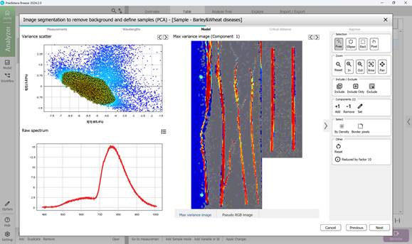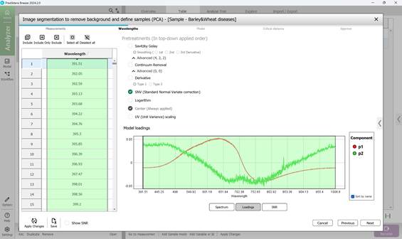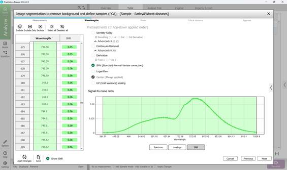 2) выбор спектральных полос в рамках определенных волновых диапазонов (по умолчанию включается весь диапазон спектральных полос; также есть функции предварительной обработки данных – по умолчанию применяется SNV), что включает в себя: