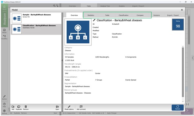 Общую информацию о созданной модели PLS-DA, в том числе статистике, качестве предсказания и ключевых статистических метриках можно получить в меню «Model» при навигации между основными кнопками в пределах построенной классификационной модели. В разделе «Overview» содержится информация о количестве образцов, спектральных каналов, главных компонентах, волновом диапазоне, параметрах предварительной обработки, кросс-валидации, модели сегментации и др. (рисунок 66).