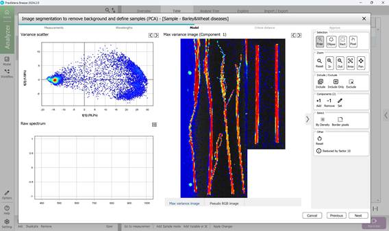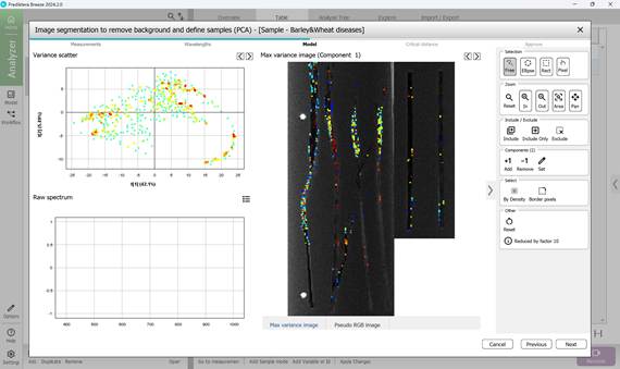 - identifying Regions of Interest (ROI) that contain pixels representing diseased areas, usually indicated by bright colours (mainly red and yellow) clustered in scatter plots. Pixel inclusion or exclusion is controlled via the toolbar on the right, which also offers tools to remove boundary pixels if needed (Figures 46, 47, 48)