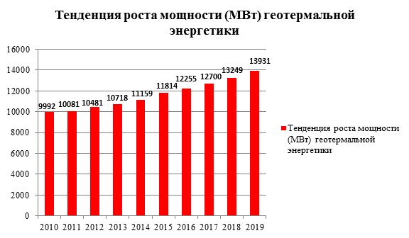 По диаграмме видно, что в мире наблюдается постепенное наращивание мощностей геотермальных электростанций. Так за последнее десятилетие мощность станций возросло на 3939 МВт (2010 г. – 9992 МВт, 2019 г. – 13991 МВт, около 0,55% от общей мощности возобновляемой энергетики во всем мире). В 2019 году на геотермальных электростанциях в общем было произведено 85978 ГВт*ч электроэнергии.