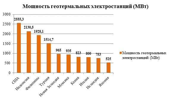 Крупнейшим производителем геотермальной электроэнергии являются США, суммарная мощность ее геотермальных электростанций составляет 2550,3 МВт (смотри рисунок - 12).