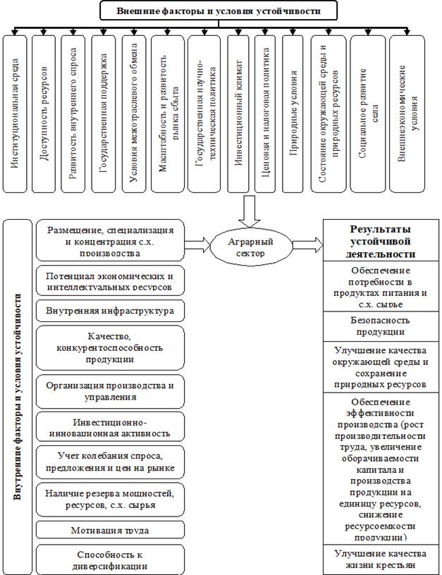 При классификации факторов и условий, формирующих устойчивость развития отрасли, необходимо учитывать следующие положения. Наиболее обоснованным считается деление устойчивости сельского хозяйства на экономическую, социальную и экологическую составляющие. Исходя из всего многообразия действующих на него факторов и условий, их можно подразделить на две группы: внешние и внутренние (рисунок 18).