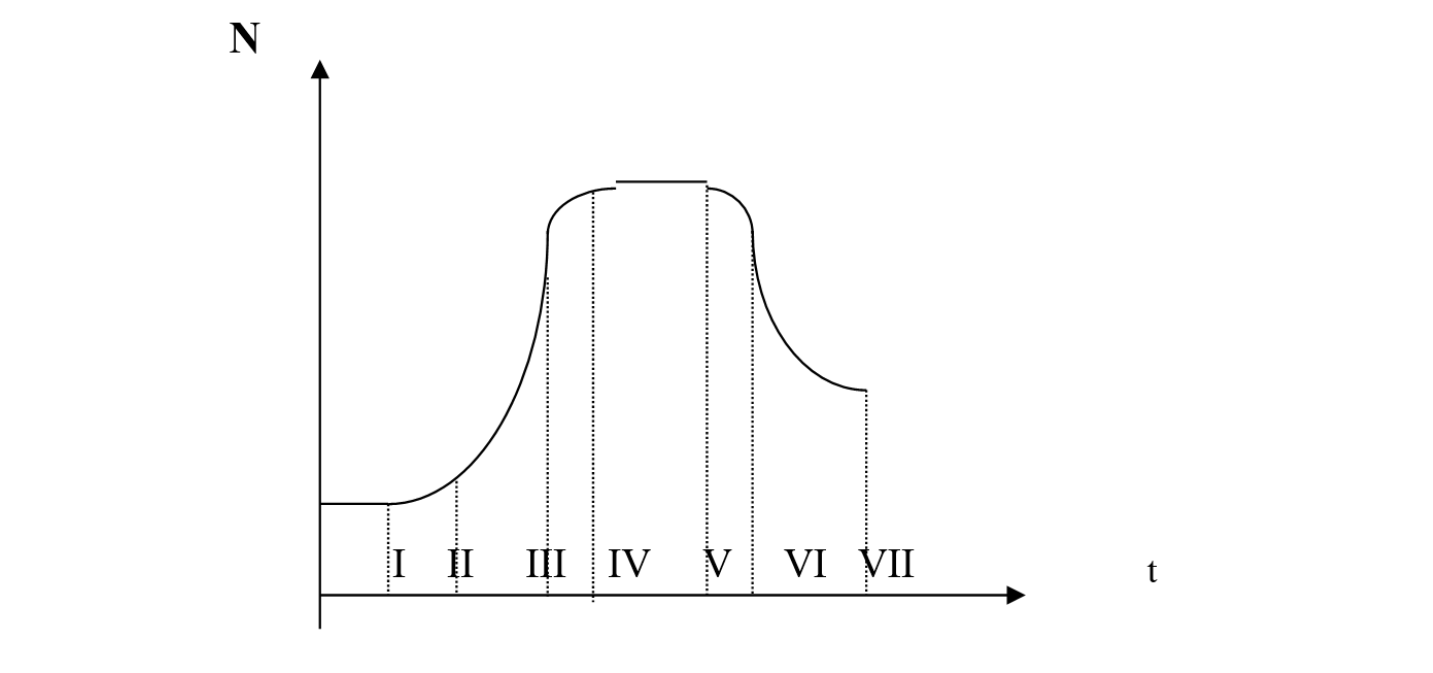 Рисунок 2.1 – Кривая роста микроорганизмов (зависимость количества клеток от времени культивирования); I , II , III , IV , V , VI , VII – фазы роста