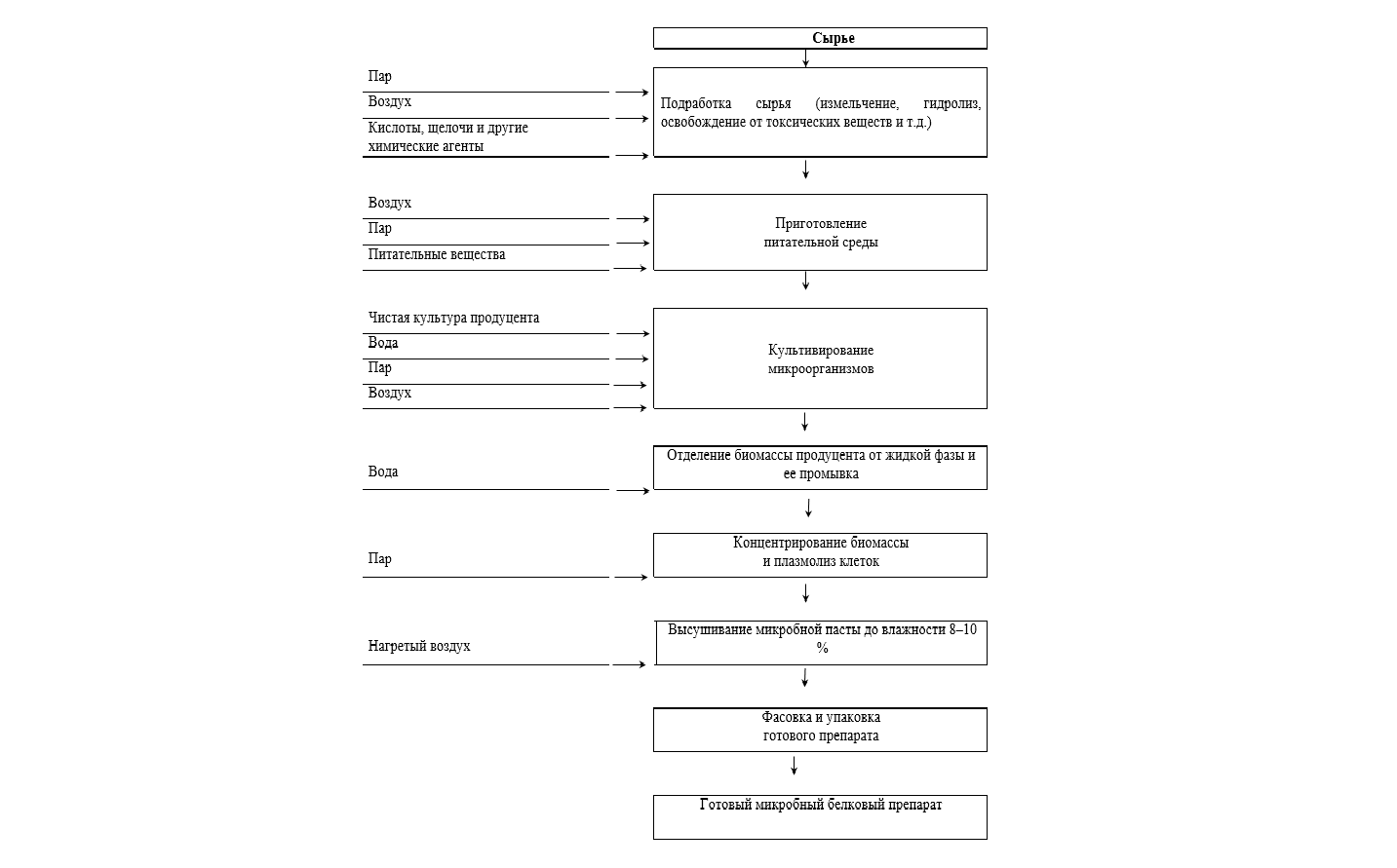 Рисунок 5.1 – Основные стадии процесса производства микробных белковых препаратов биомассы; фасовка и упаковка готового препарата