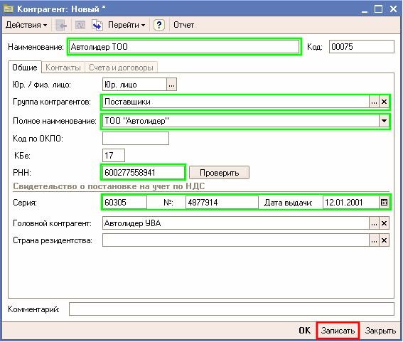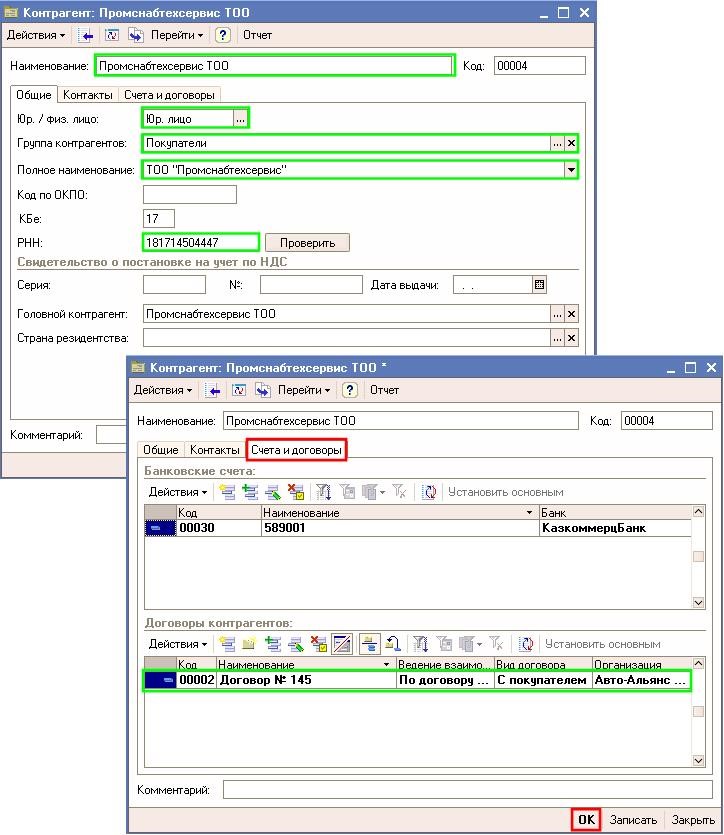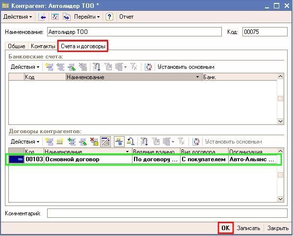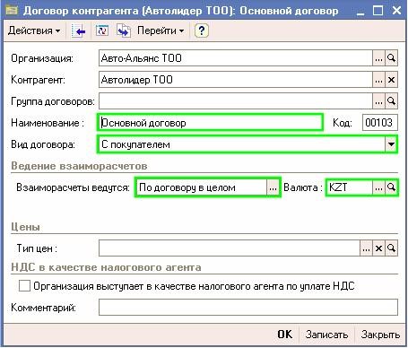 “Контрагенттер” формасындағы “Шоттар және шарттар” қыстырмасына ауысыңыз. Әр контрагентке бір шарт туралы минимум ақпарат әрбіреуіне толтыру керек. Осы шартта іскр серіктестер қызметшілігінің жағдайлары осында қойылады. Шарттар тізімінде “Негізгі шарт” атымен шарт қатыстырылған және “сатып алушылармен ” түріндегі шарты.