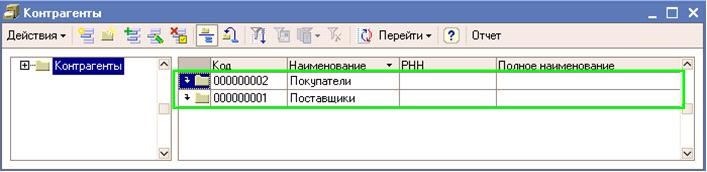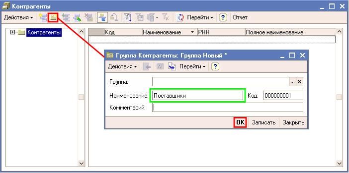 “Контрагенттер” тізімінде “Жабдықтаушылар” және “Сатып алушылар” контрагент тобын құрыңыз. “Жабдықтаушылар” тобын қосу үшін ; форма тізіміндегі командалық тақтасындағы