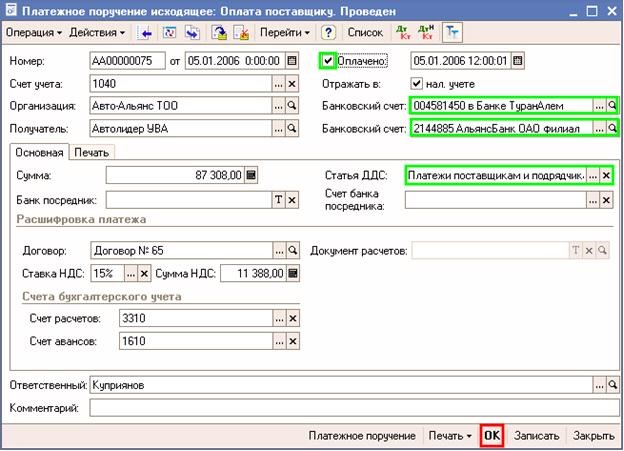 Ұйым шотының есеп айырысуынан жеткізушіге ақша құралдарын аудару: төлем тапсырысы