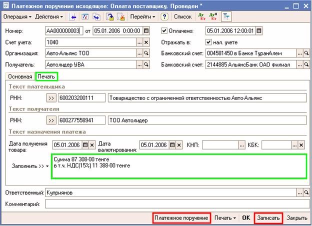 «Шығатын төлем тапсырысы» атты құжаттың төменгі бөлігіндегі «Жазып алу» пернесін басыңыз. Төлем тапсырысының басылған қалыбын алу үшін «Төлем тапсырысы» батырмасын басыңыз.