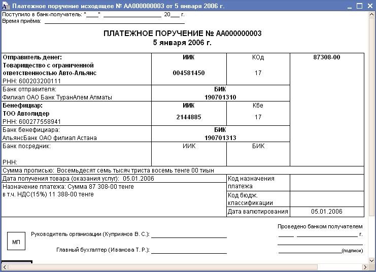 «Төлем тапсырысы (шығатын)» құжатынан төлем тапсырыссының формасы компьютерден басып шығару мен банкке тапсыру үшін шығарылады.